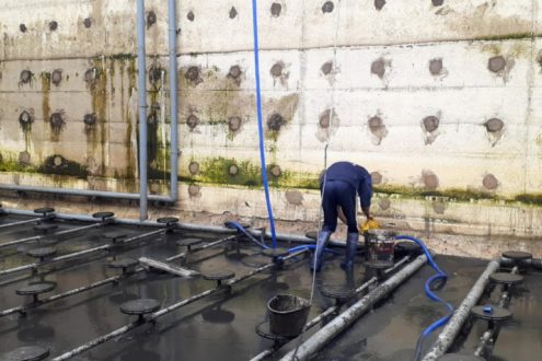 - Vệ sinh các cụm bể xử lý hóa lý, moto khuấy, hệ thống máng răng cưa, ống lắng trung tâm, bơm bùn. Vệ sinh thành, đáy bể xử lý hóa lý (keo tụ tạo bông – lắng hóa lý.